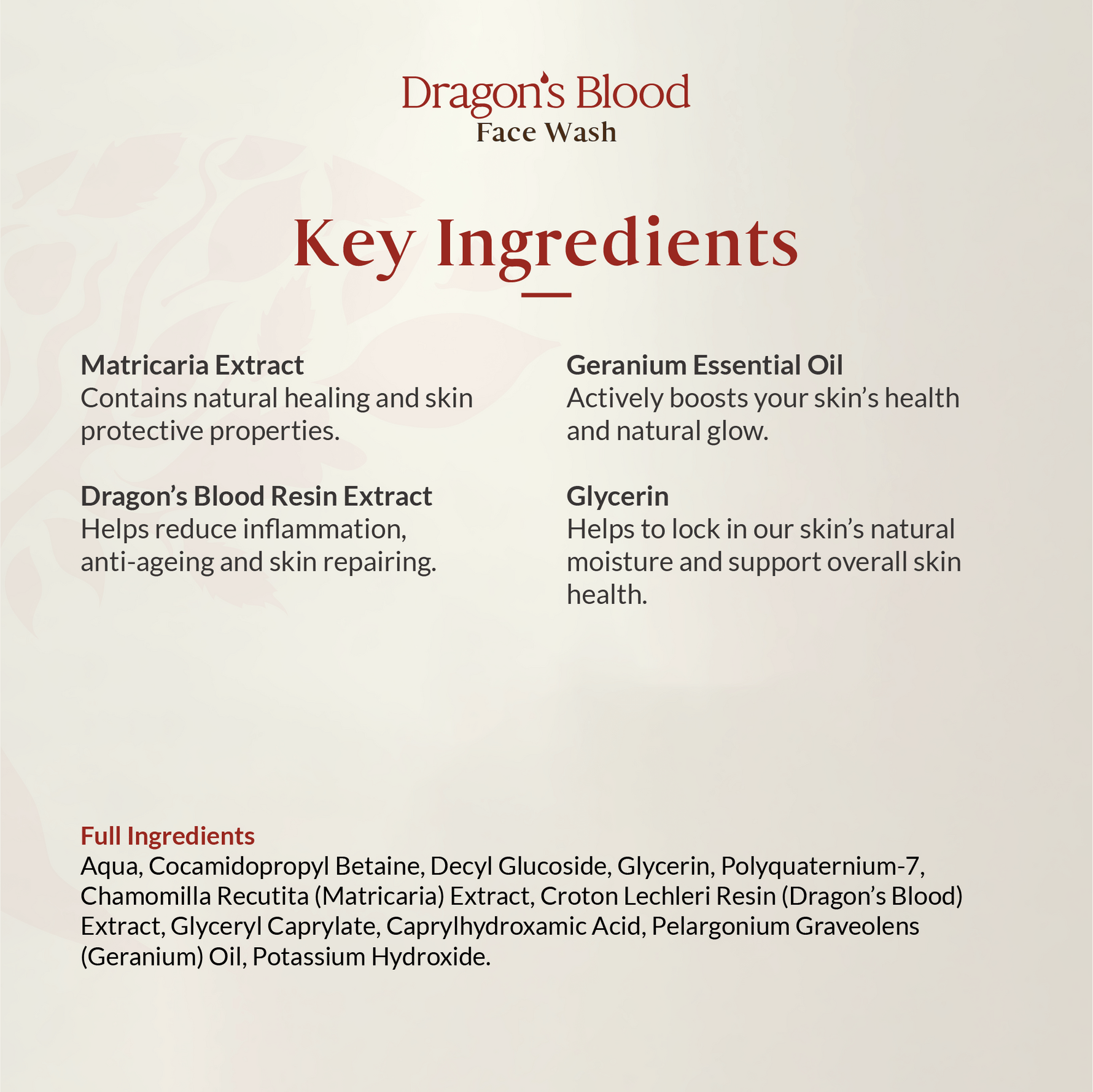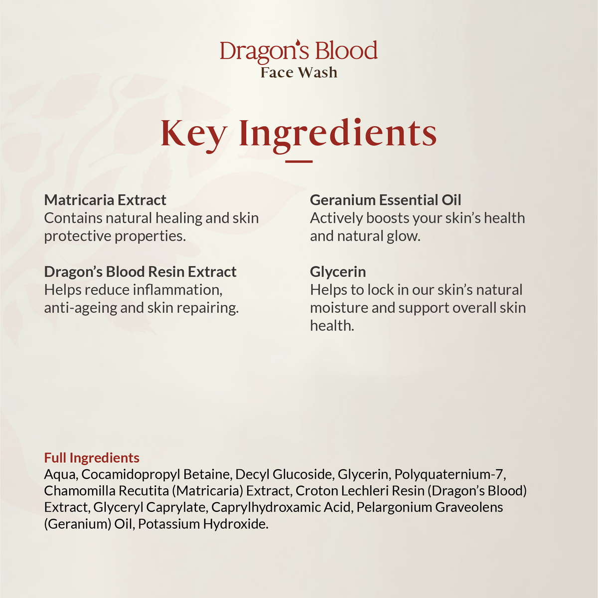 This uniquely crafted Dragon’s Blood Face Wash gently lifts away impurities while leaving your skin feeling soft and smooth. Enjoy a moisturised, refreshed finish that reveals a naturally radiant and supple glow.