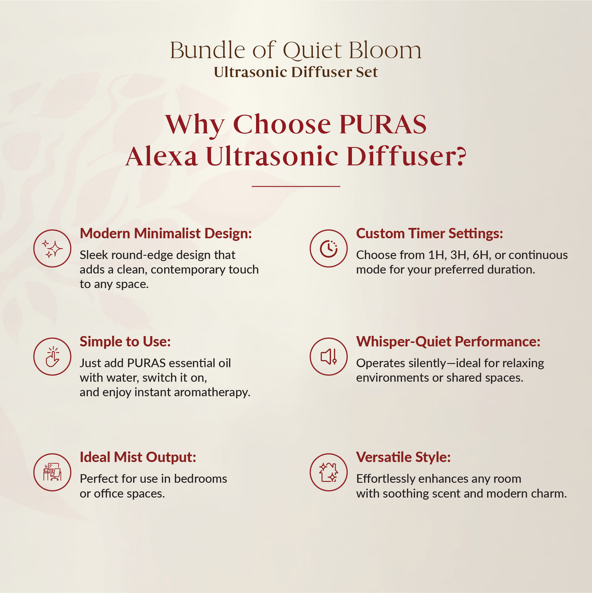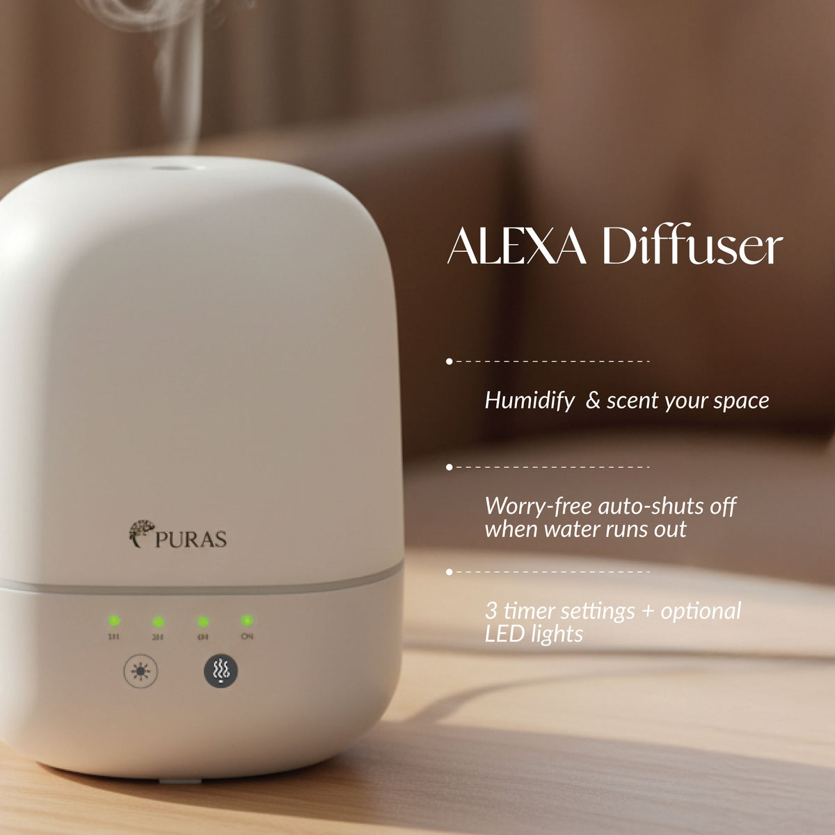 Transform your space with the PURAS ALEXA Ultrasonic Diffuser – where style meets serenity. Designed with a sleek round-edge finish, this elegant diffuser features 4 timer settings (1H/3H/6H/ON), a calming mist, and soft ambient lighting to elevate any room. Perfect for boosting your mood, easing stress, and adding a modern, calming touch to your home décor.