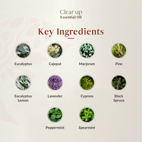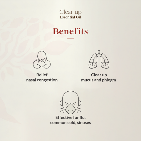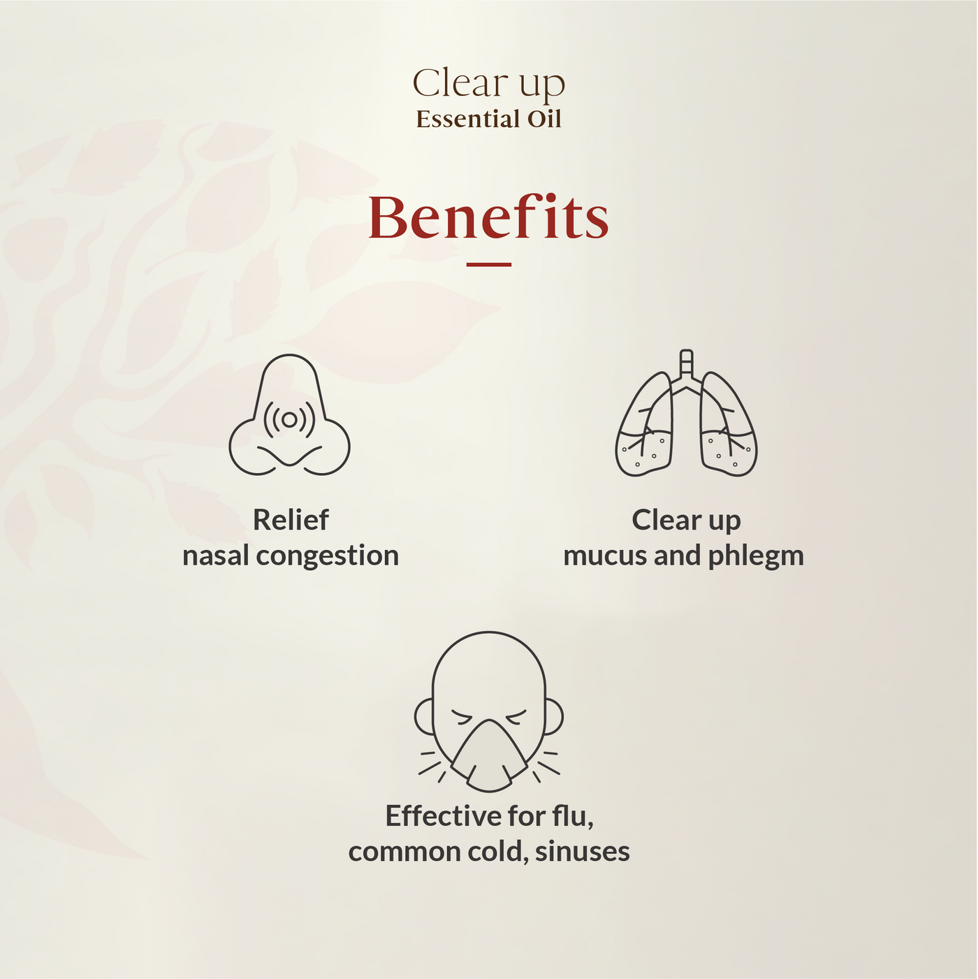Clear Up is a refreshing, herbaceous essential oil blend featuring Eucalyptus, Cajeput, Marjoram, and more, known for their crisp and invigorating aroma. This blend helps create a sense of clarity and ease, making it a great companion during seasonal changes. When diffused or applied with a carrier oil, it provides a cooling and soothing sensation, helping to refresh the senses and promote a feeling of comfort and relaxation especially when you have a stuffy nose.