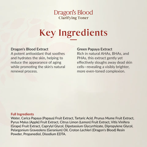 Water, Carica Papaya (Papaya) Fruit Extract, Tartaric Acid, Prunus Mume Fruit Extract, Pyrus Malus (Apple) Fruit Extract, Citrus Limon (Lemon) Fruit Extract, Vitis Vinifera (Grape) Fruit Extract, Caprylyl Glycol, Dipotassium Glycyrrhizate, Dipropylene Glycol, Pelargonium Graveolens (Geranium) Oil, Croton Lechleri Resin Powder, Propanediol, Disodium EDTA.