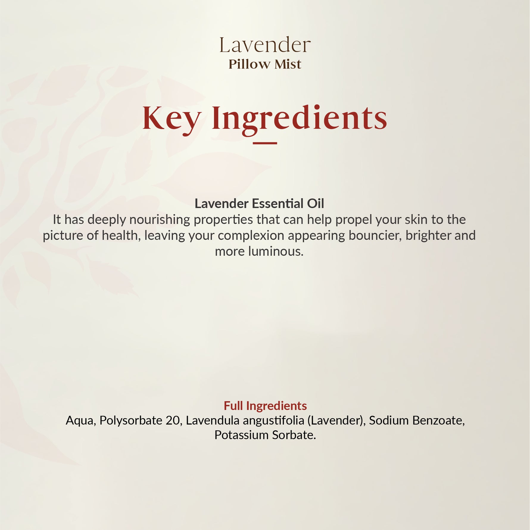 Aqua, Polysorbate 20, Lavandula Angustifolia (Lavender) Oil, Sodium Benzoate, Potassium Sorbate.