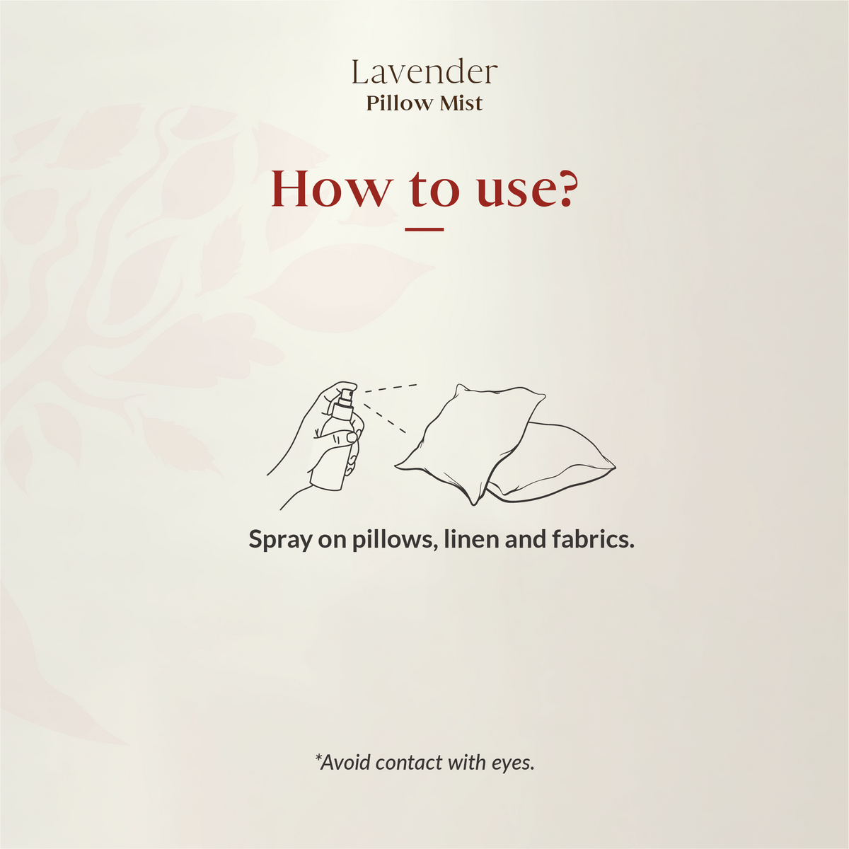 Lightly spray onto pillow, linen, or fabrics, allowing a few minutes for the scent to disperse before lying down. Shake well before use.