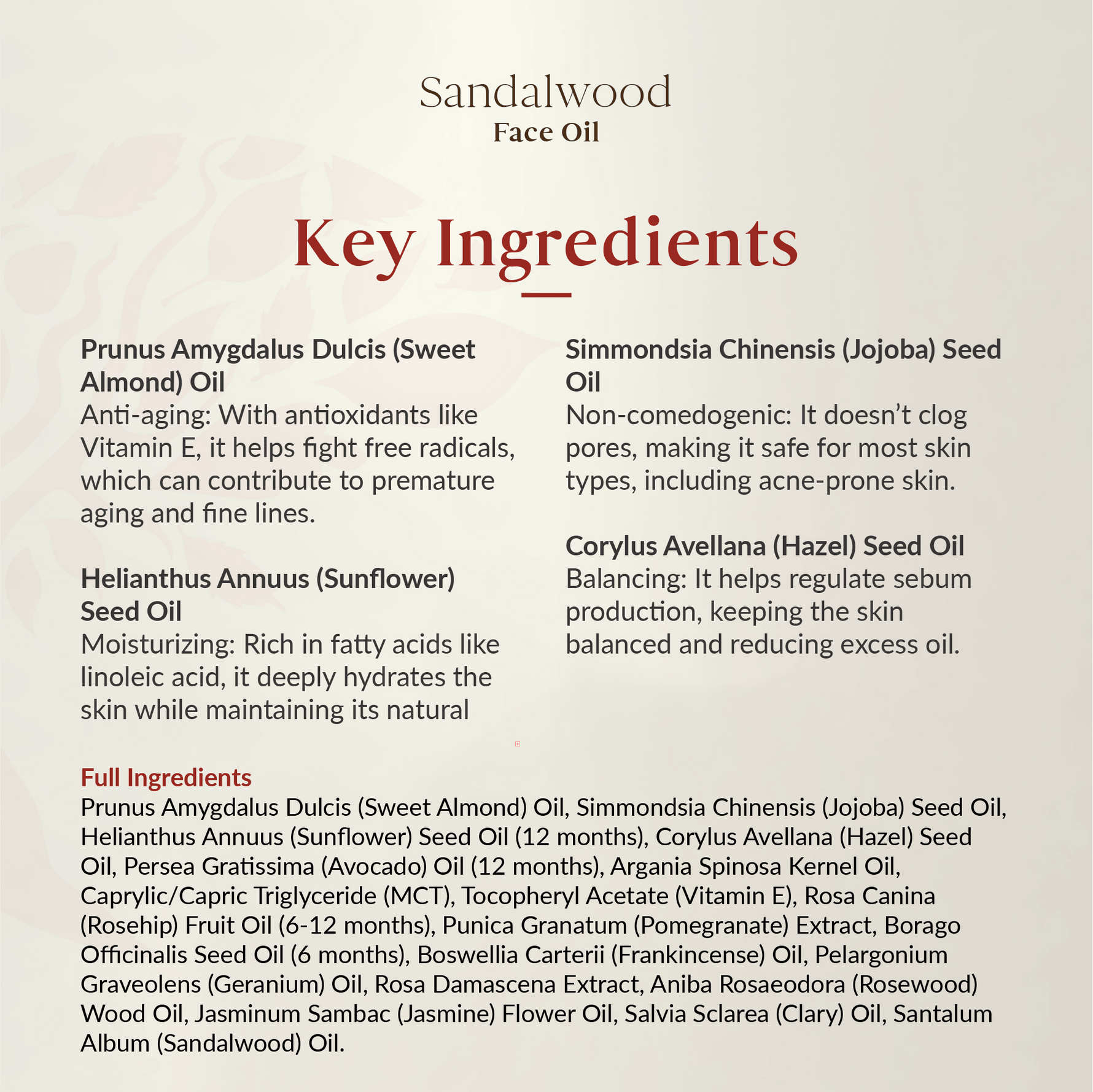 Prunus Amygdalus Dulcis (Sweet Almond) Oil, Simmondsia Chinensis (Jojoba) Seed Oil, Helianthus Annuus (Sunflower) Seed Oil, Corylus Avellana (Hazel) Seed Oil, Persea Gratissima (Avocado) Oil, Argania Spinosa Kernel Oil, Caprylic/Capric Triglyceride (MCT), Tocopheryl Acetate (Vitamin E), Rosa Canina (Rosehip) Fruit Oil, Punica Granatum (Pomegranate) Extract, Borago Officinalis Seed Oil, Boswellia Carterii (Frankincense) Oil, Pelargonium Graveolens (Geranium) Oil, Rosa Damascena Extract, Aniba Rosaeodora (Rosewood) Wood Oil, Jasminum Sambac (Jasmine) Flower Oil, Salvia Sclarea (Clary) Oil, Santalum Album (Sandalwood) Oil. The ingredients in this product may change from time to time. For the most accurate and up-to-date information, we kindly recommend checking the product label before use.